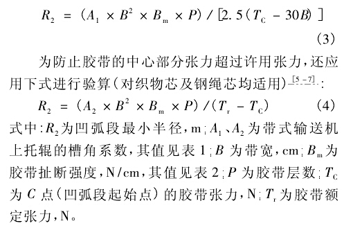 由式1可計(jì)算得出凹弧段的最小半徑。但是當(dāng)膠帶的張力過(guò)低時(shí),膠帶的邊緣處有可能產(chǎn)生皺曲,將無(wú)法保證皮帶輸送機(jī)的安全運(yùn)行,因此需對(duì)該半徑值進(jìn)行必要的校核。鑒于目前國(guó)內(nèi)尚無(wú)成熟的計(jì)算公式可循,建議采用美國(guó)輸送設(shè)備制造商協(xié)會(huì)聯(lián)合會(huì)推薦的公式對(duì)最小半徑進(jìn)行驗(yàn)算,以保證膠帶具有足夠張力,避免在凹弧段處的膠帶邊緣出現(xiàn)零張力'對(duì)織物芯膠帶,用下式進(jìn)行驗(yàn)算: