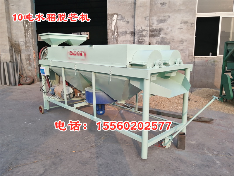 水稻除芒機,是一種專門用于對帶芒水稻種子及其它帶芒刺種子進行芒、刺處理的機具。適用于種子加工成套設備的配套使用。 結構特點 該機主要由:機殼、傳動軸、打桿、活門調節裝置、驅動裝置等部件組成。采用旋轉打桿及其配合的內襯耐磨板,對種子表面施加搓擠、打擊作用,以除去芒、刺毛、松散的穎片及未脫凈的穗頭、莢殼等。通過清除芒、刺,改善了種子的表面,有利于種子加工的下道工序的作業。